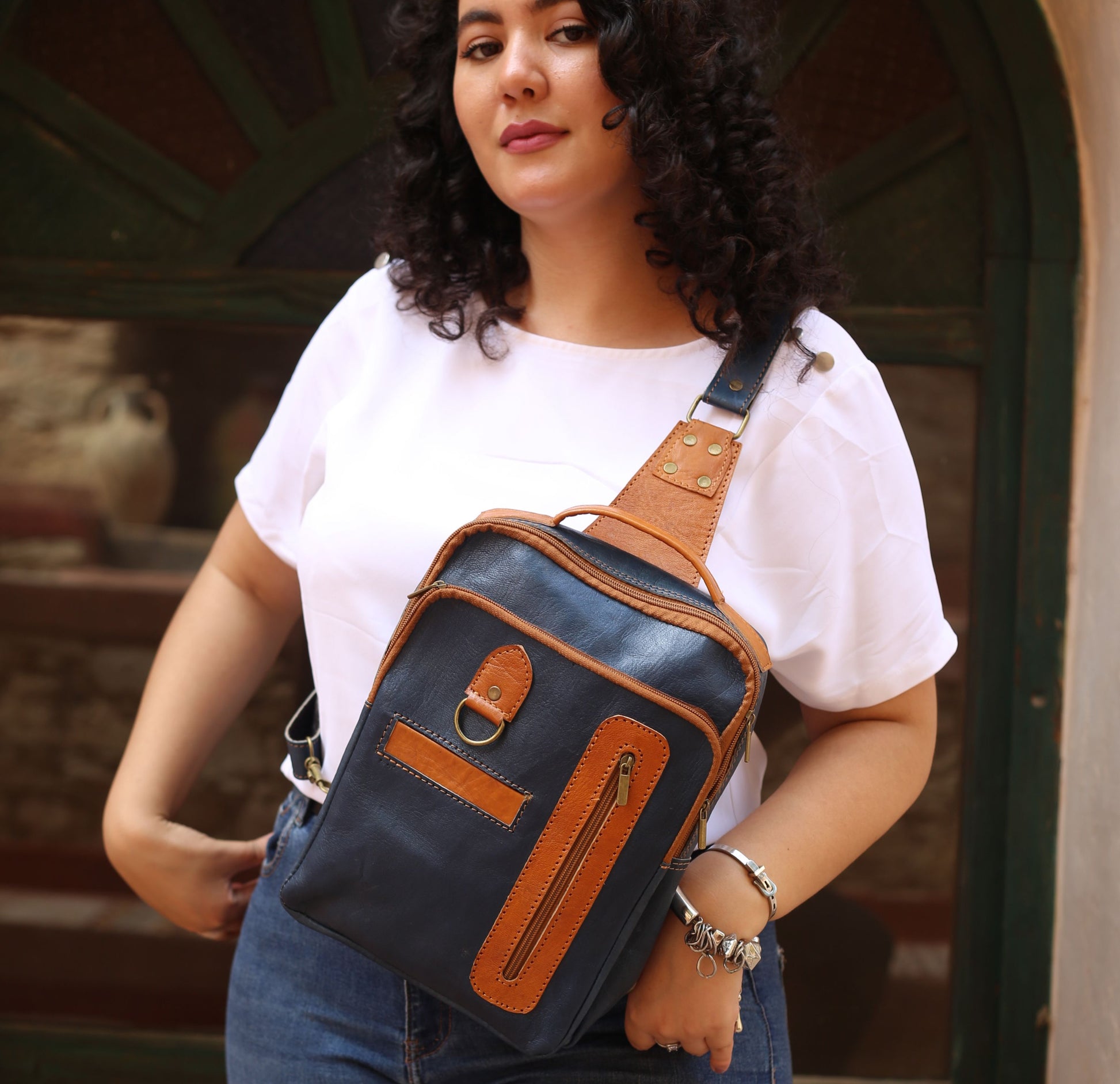 This stylish and modern crossbody bag is crafted from premium navy blue leather, beautifully contrasted with tan accents. Its bold design and functional features make it a standout accessory for any occasion.